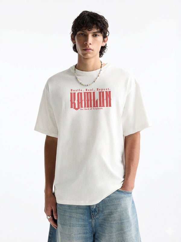Keywords: white t-shirt, oversized puff print, 240 GSM cotton, unisex streetwear, sustainable fashion, kamlon brand, chest logo, heavyweight cotton, premium quality tee, modern streetwear essential